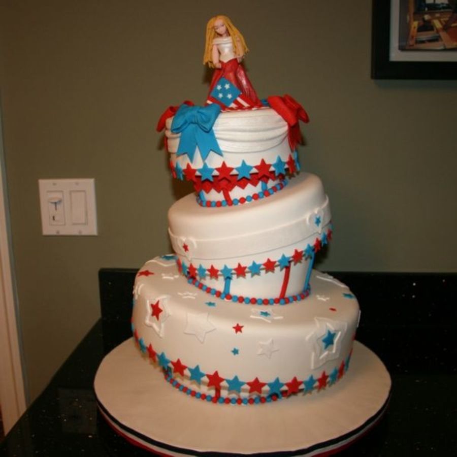 Critique Subgroup Member: Great cake! Your decorations are perfect. I love all the different combos. Drapes and bows are perfect. The figure's face is excellent, as is her hair. My perceived improvements: the stripes on the flag need to be perfectly straight and flush up against the star part and I think the board is too big. I think it brings the eye down instead of up where it should be. I love the white on white cutouts and your fondant is perfection! Excellent work here.
