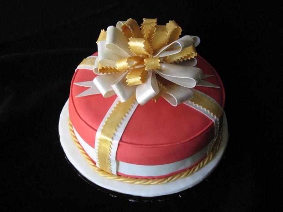 My first traditional fruitcake. Covered in marzipan and fondant. Gumpaste bow painted with gold and pearl lustre dust.
