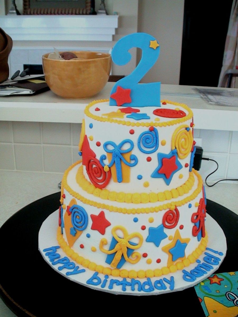 Bottom tier 8" chocolate with strawberry filling, top is 6" pineapple with strawberry filling. Fondant stars and presents, gumpaste #2. Also added stars on wires when I got to the party, but couldn't get a good picture in the light at the party. All the colors looked neon in the flourescent lights. tfl.