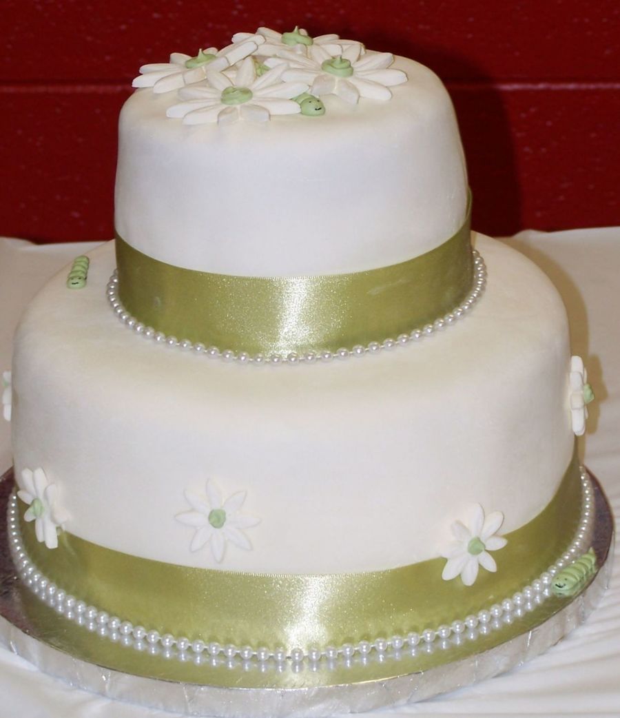 Two Tier, 6 and 10 inch rounds. Covered in MMF. MMF daisies, RI caterpillars(hard to see them). This was for my son's teacher who LOVES bugs(hence the caterpillars!) and the color green. Ribbon and pearls are not edible. I have a pink version of this cake in my photos. Thanks for looking!