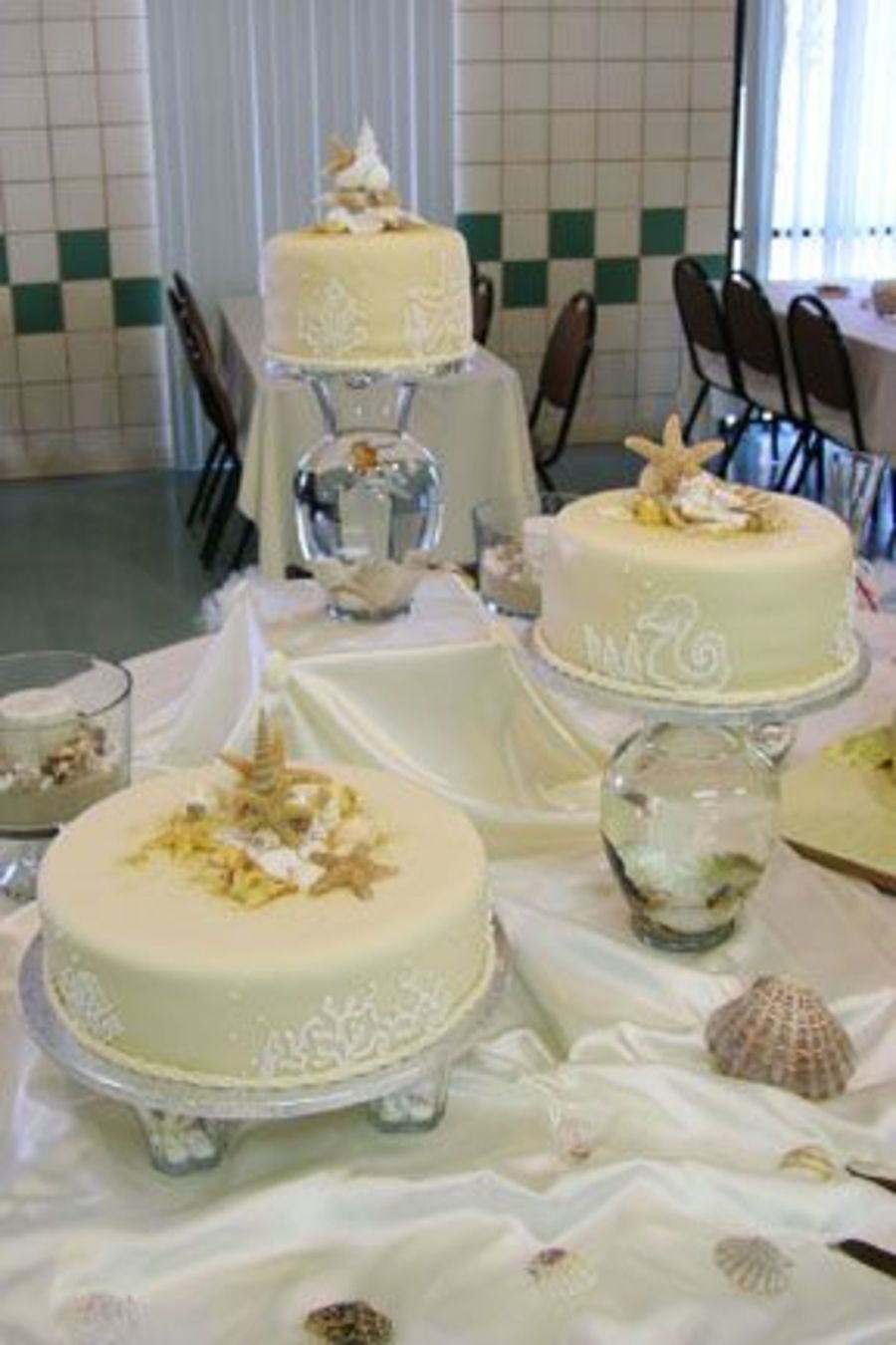 Critique Subgroup Member: Beautiful cakes. The shells are awesome -- very realistic and the brush embroidery looks nice, but I can't really see it too well in this photo. I'm sure the sea-loving bride and groom loved these cakes!