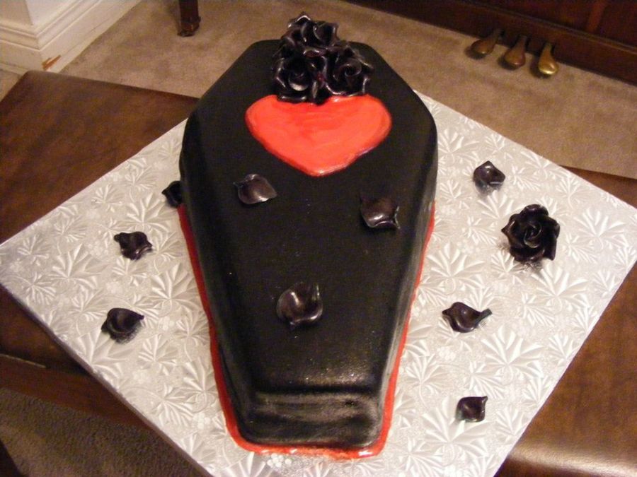 chocolate fudge cake filled with raspberry filling and coated with dark chocolate fondant and then painted in black disco dusts with a sparkle gel heart and black sugar roses and petals... gothic birthday