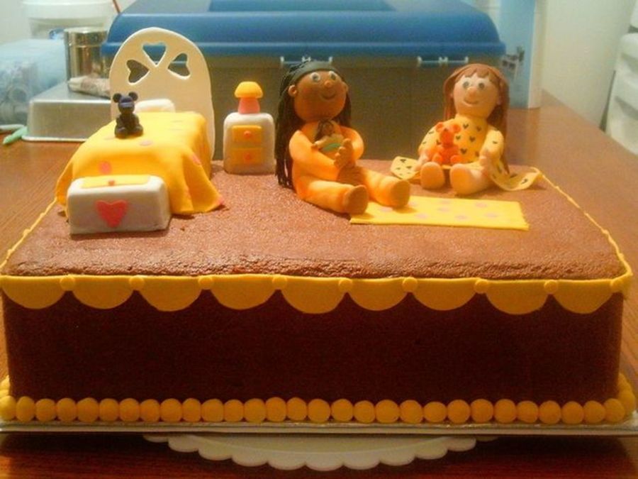 Sorry this pic isn't very clear. This was a bunch of "firsts" for me. First time using Satin Ice, molding with rice krispy treats (bed, night stand, and chest), and making fondant figures. The black-haired girl actually has on orange and yellow tie-dye type PJ's. The brown-haired girl has on a yellow nightgown with blue hearts. The bed and the rug are yellow with pink dots. This was a lot of fun to do, but that Satin Ice was very tempting. . .it really is good!! Thanks for looking!