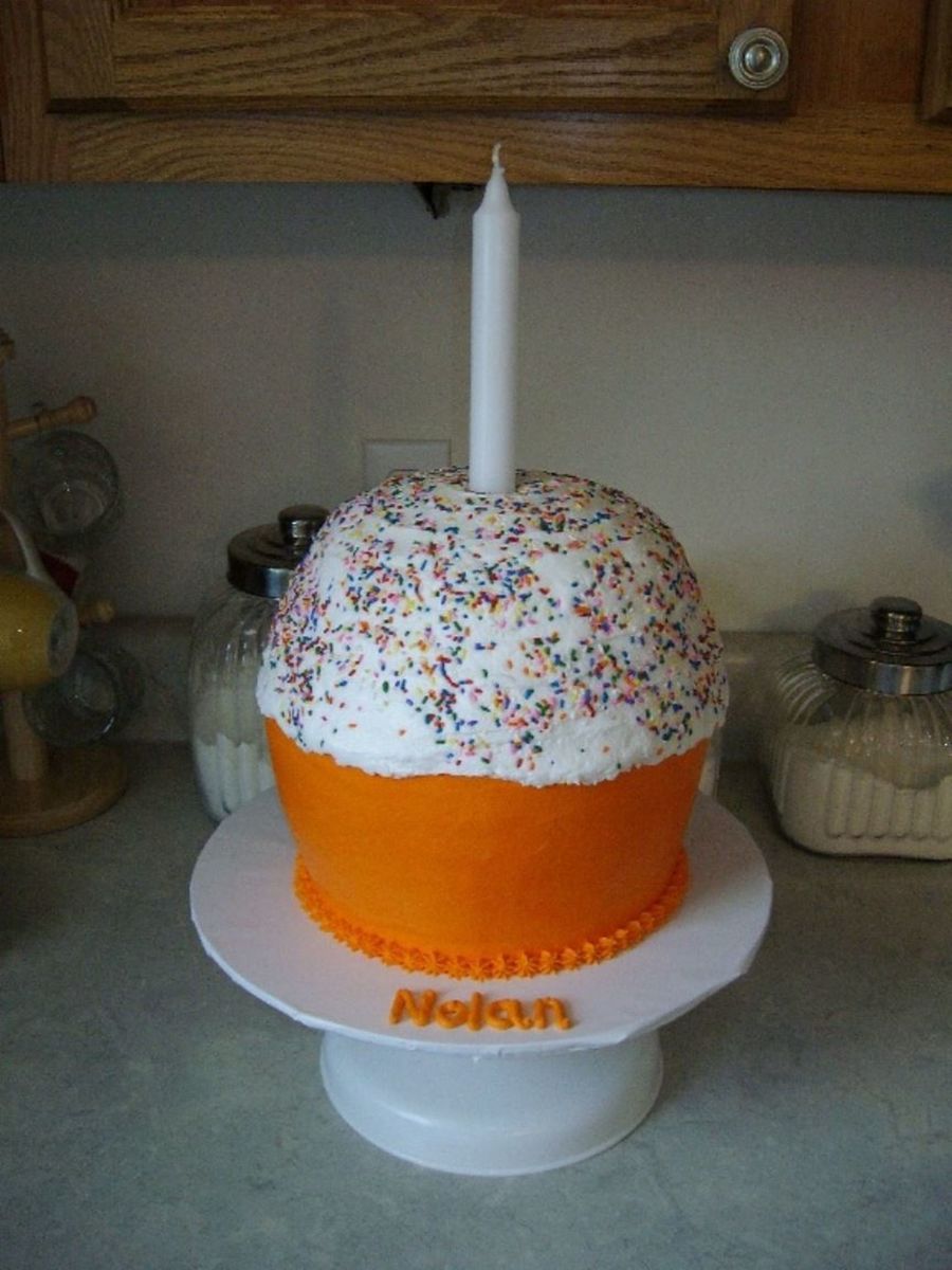 Two 8 inch layers on the bottom and two 9 inch on top of that. I baked the cakes without baking strips to get a good dome and cut all the domes off, using them to stack on top of the 9 inch cakes. Cakes were frozen and carved to shape. Small taper candle in the top. Had a bit of a problem transporting this one. :-)