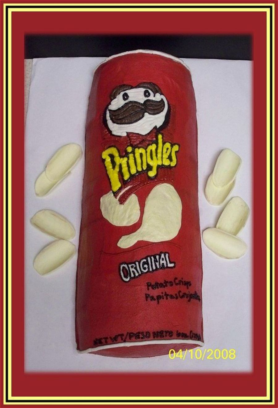 Pringles can made from five 6" rounds cut in half and stacked side by side, flat side down. Frosted in buttercream. Fondant chips.