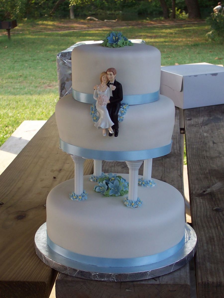 White cake covered in fondant. The flowers on top and in the middle are royal icing petunias and the flowers around the columns are blue drop flowers. The bride wanted simple but elegant and was very pleased with the cake. I used a blue ribbon around the bottom edge to cover the little problem areas I had with the fondant.