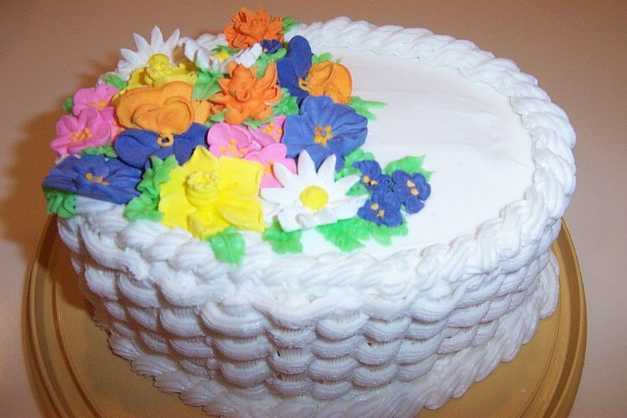 I made this cake at the end of taking Wilton Course 3. In course 3 we learned the basketweave technique & also how to make quite a few different types of flowers using royal icing, which is what all the flowers on this cake are made of.