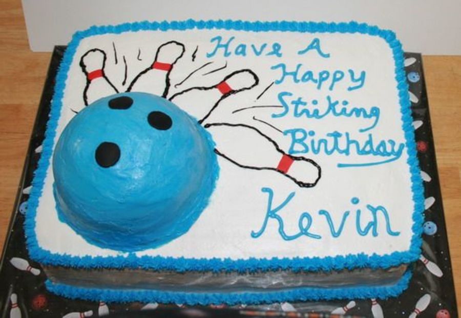Bowling Party Cake. Used the sports ball for the Bowling Ball. He loved the cake. My Elbow was bruised and swollen so it wasn't easy to work witht he icing. That is why the ball is a little messy. It was the third cake in two days and my arm was giving out.