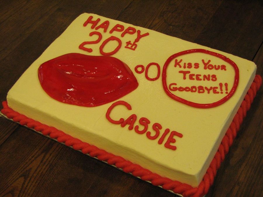 For a friend's daughter's 20th birthday (hence the "Kiss your teens goodbye!"). This was my first attempt of carving a cake (the lips). The lips are covered with fondant, then painted with red gel for the shine. Thanks for looking.