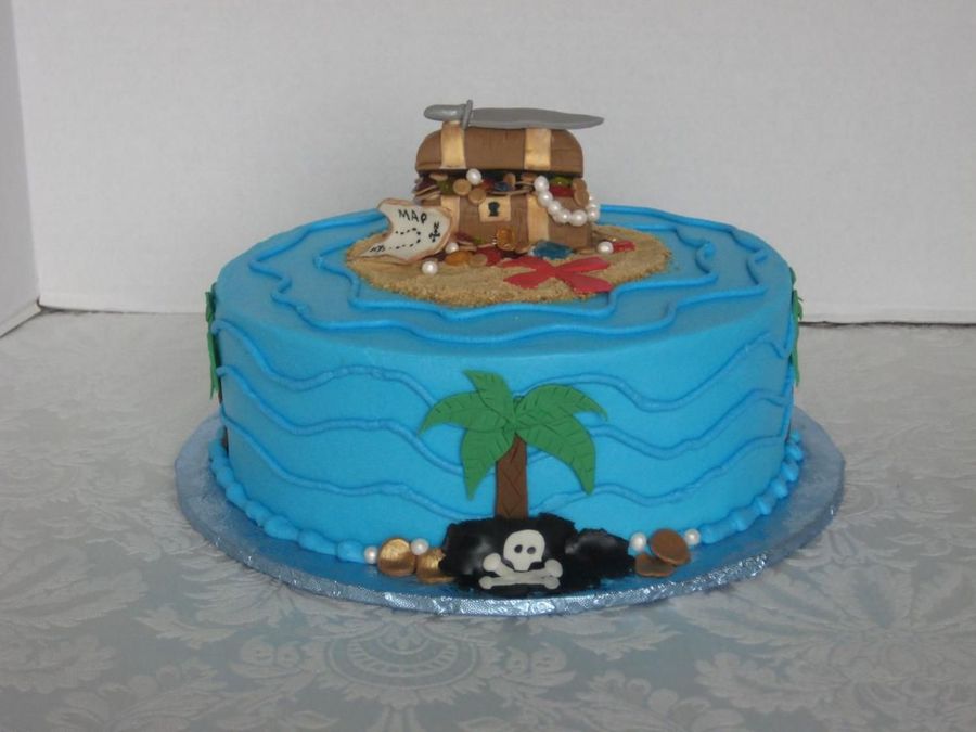 Critique group member: Wow! Thgis is cake is so cool! All of the accessories are amazing! The only thing that bugs me is those waves, I know everyone else loved them but here are my thoughts: The whole cake is so realistic looking with the palm tree and chest etc., then all of a sudden you hit the fake looking waves and to me that kind kills the effect. I think you either need to make the waves more realistic or just lose them period.