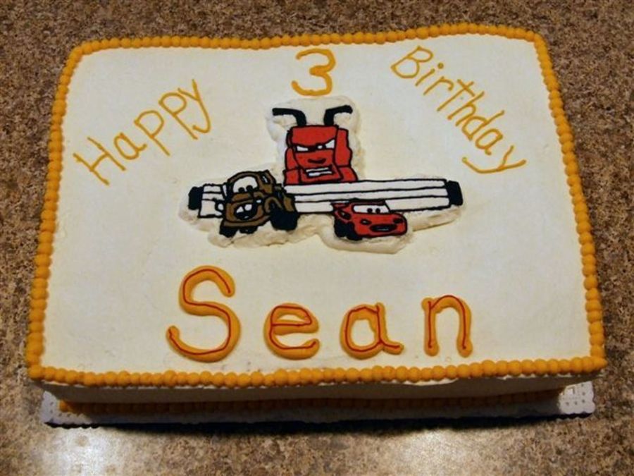 My son wanted his favorite scene from Cars on his cake. Figures it the scene with Frank chasing Mater and Lightning McQueen! This was a 9x13 cake with FBCT. I am happy to say he loved it and cut Frank right out of the middle for his piece! :) Thanks for looking.