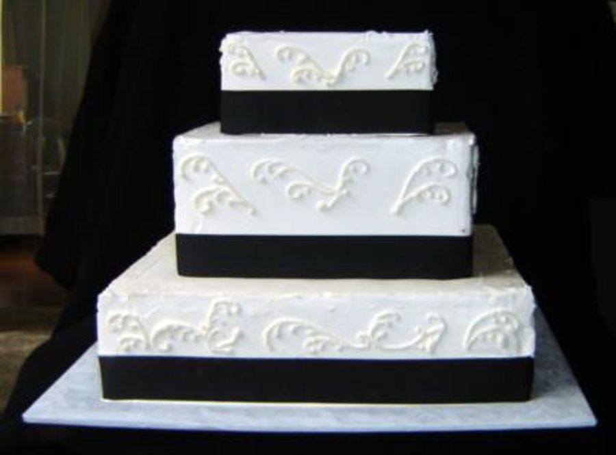 14/10/7 3 tier cake with buttercream and black grosgrain ribbon. Top was eventually covered with blood red roses.