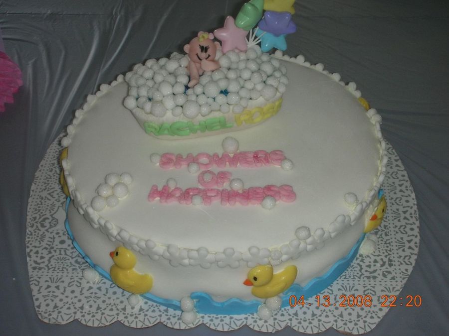 Vanilla cake with BCF made as a surprise for a mother to be. Tub was made out of gumpaste, all other were made out of fondant. Ducks are chocolate made with a mold. TFL =)