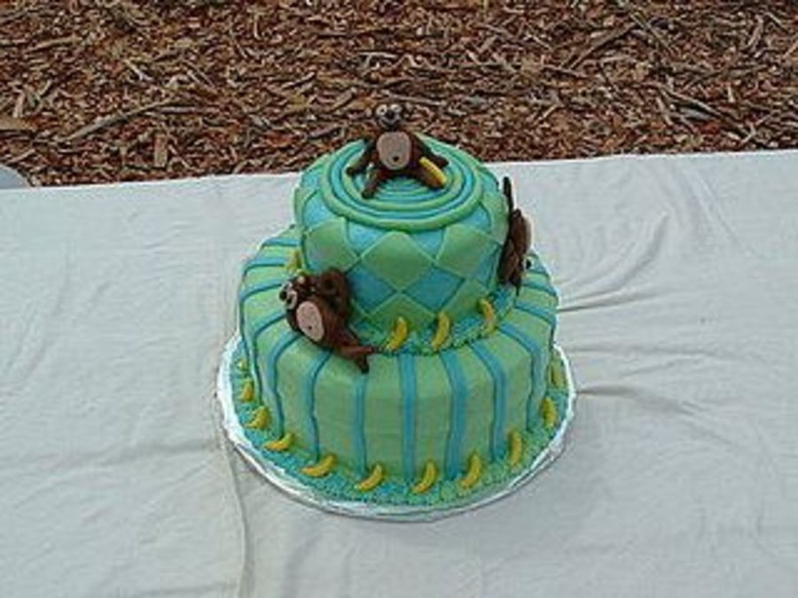 A monkey themed cake for an 8 year old's birthday that loves monkeys! The cake and icing were both vanilla. The diamonds, stripes, and monkeys were made from colored fondant.