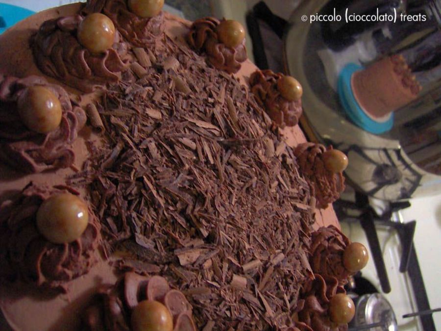 The birthday girl's only request was "as much chocolate as you can fit in" a cake. Devil's food cake, lightly whipped bittersweet ganache filling with a hint of coffee, bittersweet chocolate buttercream with a hint of cinnamon, ganache rosettes, Callebaut chocolate shavings on top, chocolate covered espresso beans to garnish