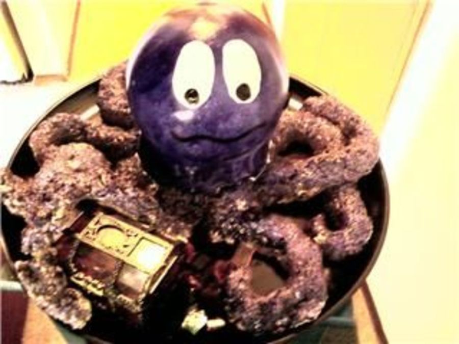 This was a last minute cake for a co-worker who specifically asked for a purple cartoonish octopus holding something. I didn't have time to fondant the tenticles like I wanted, but hey, that's how it goes sometimes. They were made out of rice krispies treats then airbrushed. In the treasure chest are gem shaped hard candies that I also made. The treasure chest is plastic.
