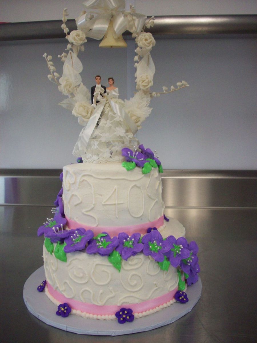 9" red velvet with cream cheese filling; 6" heavenly dark chocolate with almond buttercream. This is the couple's wedding topper from 1968!