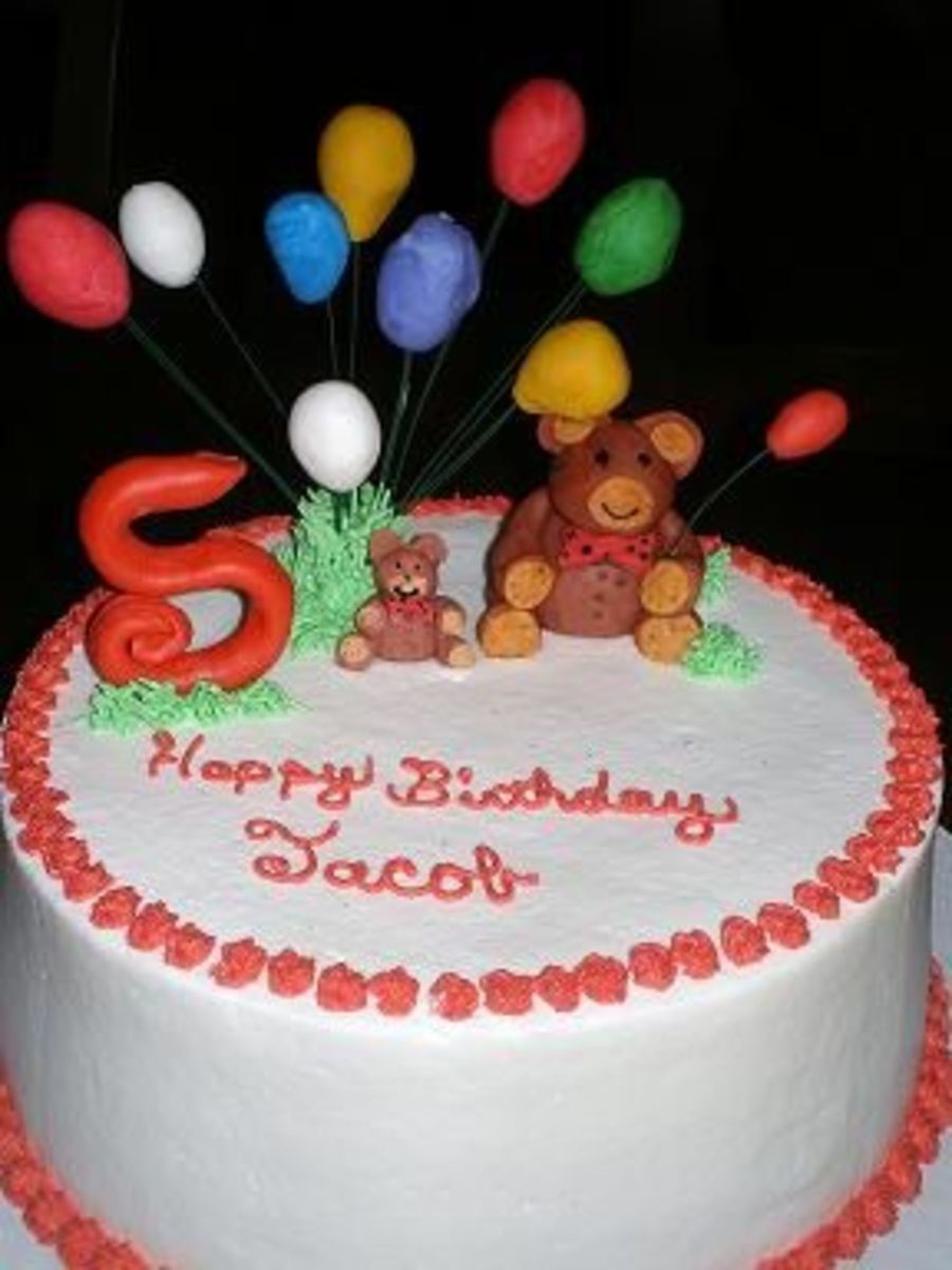 Simple Birthday cake for a 5 year old....mom wanted some kind of a teddy bear on it. Chocolate cake with caramel filling, BC, fondant bears and balloons. TFL
