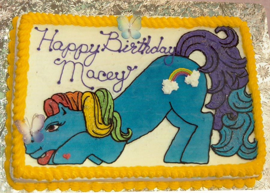 I made this for my friend's daughters 4th birthday. After frosting the entire cake, I made my own stencil for the pony's body and used Wilton's blue spray to color it. Then I outlined all the details in black and filled everything in with a variety of tips and finished it off with a couple of cute butterflies and cake sprinkles.
