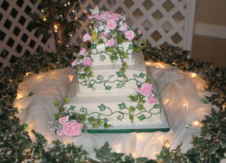 This was done for prom. They had a garden theme with pink roses and ivy. The cake is buttercream. The flowers and ivy are gum paste.