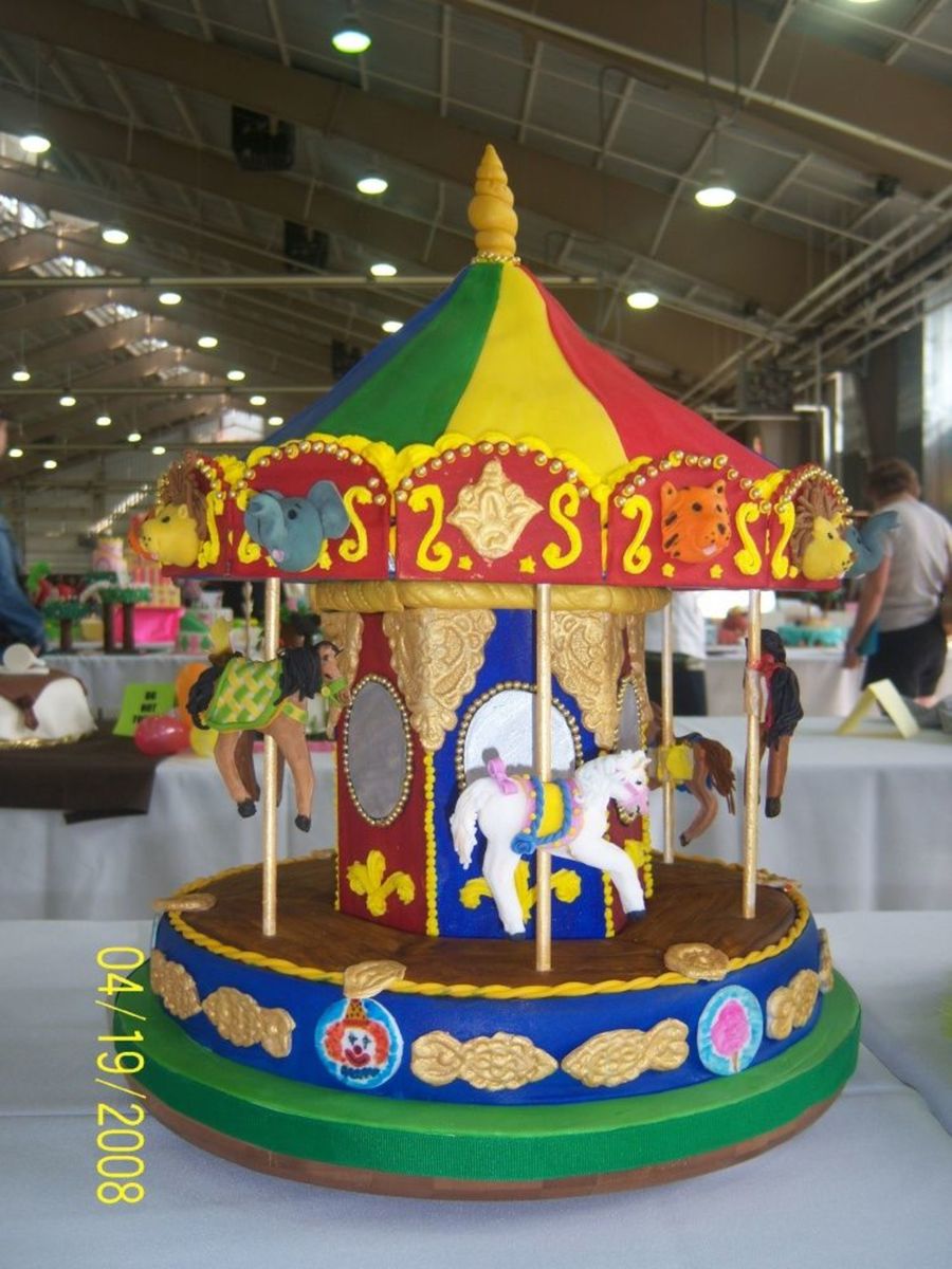 This was my entry for the Mid Atlantic Cake Show. This was my first realy cake competition. The bottom and top are 12x2 rounds and the middle are four 6" hexagons. THere is a 1 1/2 dowel thru the middle that is screwed into the bottom and top board for support. For the horses I made a mod and then molded them with gumpaste. Each horse was decorated differently. The majority of the pieces on the cake were gumpaste or fondant. The pics on the bottom cake were hand painted. TFL