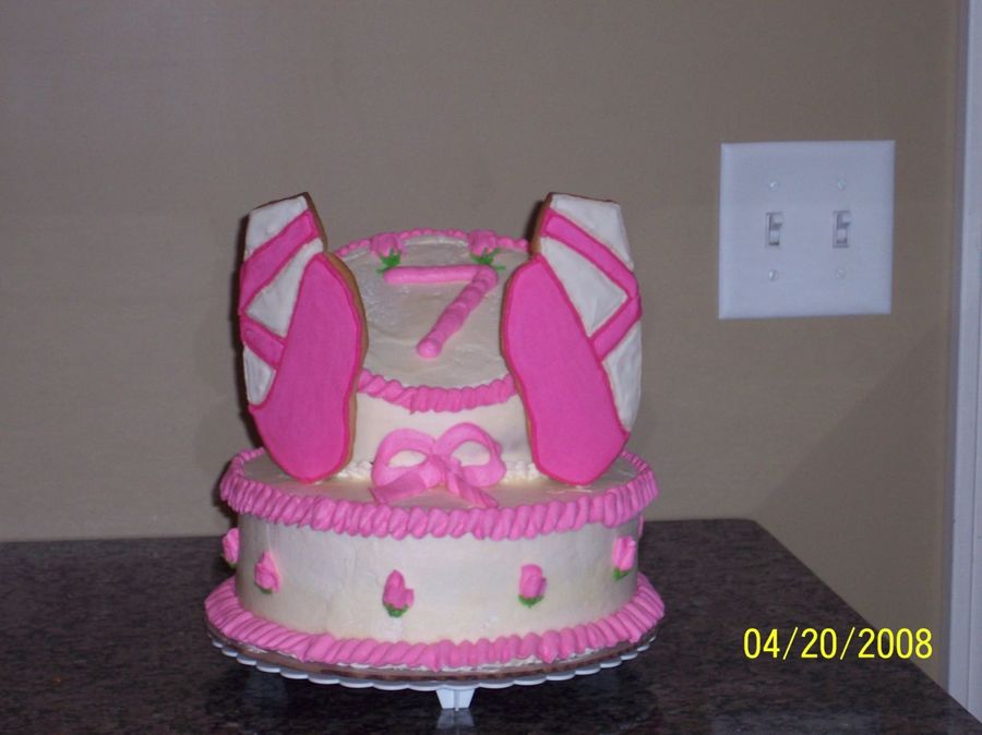 My niece wanted a cake that had ballet shoes on it. I looked on here and saw all the beautiful ballet shoes made out of fondant/gumpaste and knew that I didn't want to attempt that so this is what i came up with. I found a really nice picture of a ballet slipper on here, printed it up, and then used that as a template for the cookies on my cake. Everything else on the cake I actually came up with myself (excpet for cutting the top cake at an angle, that was my hubby's idea).