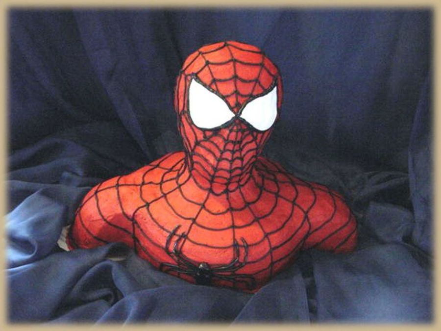 Head was RKT, body was 2-10" chocolate hazelnut cake, and arms were 1-8" chocolate marshmallow mocha cake. Neck was choc hazelnut 4" round, carved a bit. Covered in red BC (a whole jar plus of no taste red!) with black bc webs (from the Wilton tube). Eyes and spider were MMF. First time making this cake, and a BIG thanks to Lisa for her blogged instructions!
