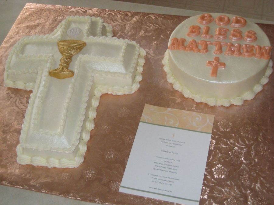 I did this this past weekend for my son. I wanted everything clean looking and to match the colors on the invite. If anyone has any tips on how to frost the cross cake, I would love to hear them. It took me solong to get it neat looking! Thanks for looking!