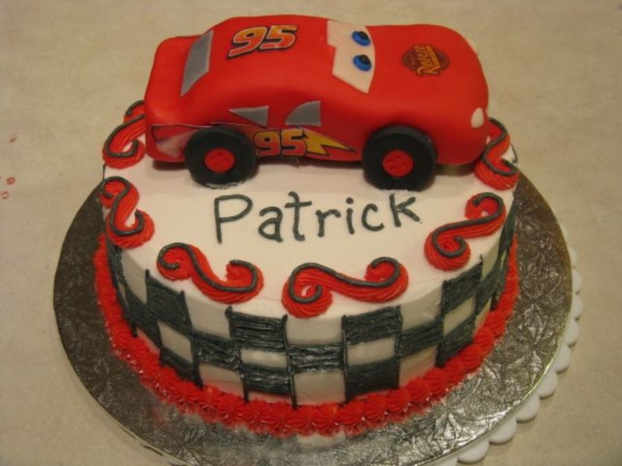 McQueen looks great! I like the black and white checks on the sides of the cake!