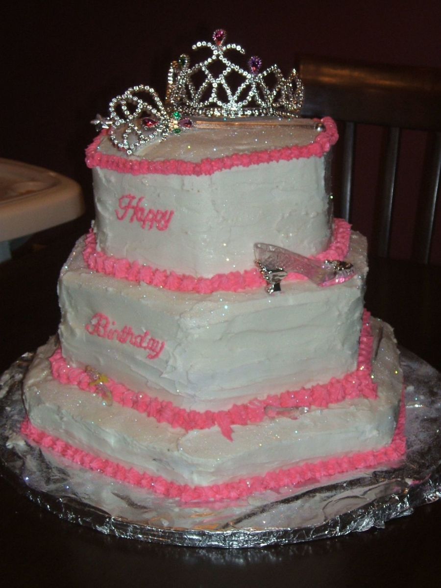 My daughter wanted a princess themed party but not disney princesstheme she also wanted a big tiered cake so I came up with this 3 tiered hexagon cake I used BC icing and piped the edges in pink and sprinkled edable glitter all over the cake placed a single glass slipper on one of the tiers top it off with a princess crown and wand on the top very simple but beautiful