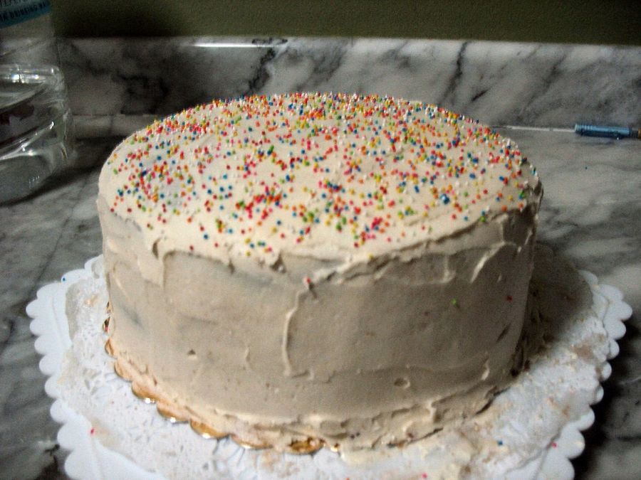 Magnolia Bakery Vanilla Cake, 3 layers with buttercream and raspberry jam. Cake a bit dry buttercream super sweet!