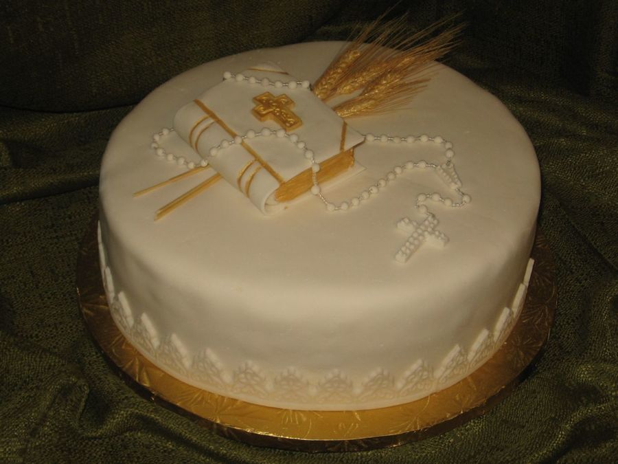 Round Cakes, 12 x 3 in, covered with Satin Ice rolled Fondant (White/Vanilla), textured lace border and 50/50 gum paste Bible, Rosary and natural wheat. A delicious Vanilla cake filled with âNutellaâ.
