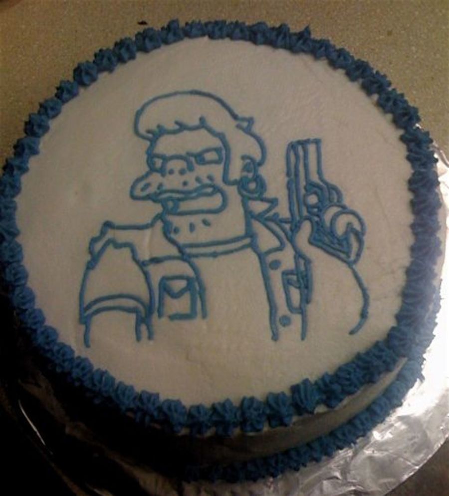 This cake was for my brothers 21st birthday. He asked me to make a cake with a snake on it, not knowing that I would make Snake from the Simpson's. He loved his cake and was very impressed with my "skills"