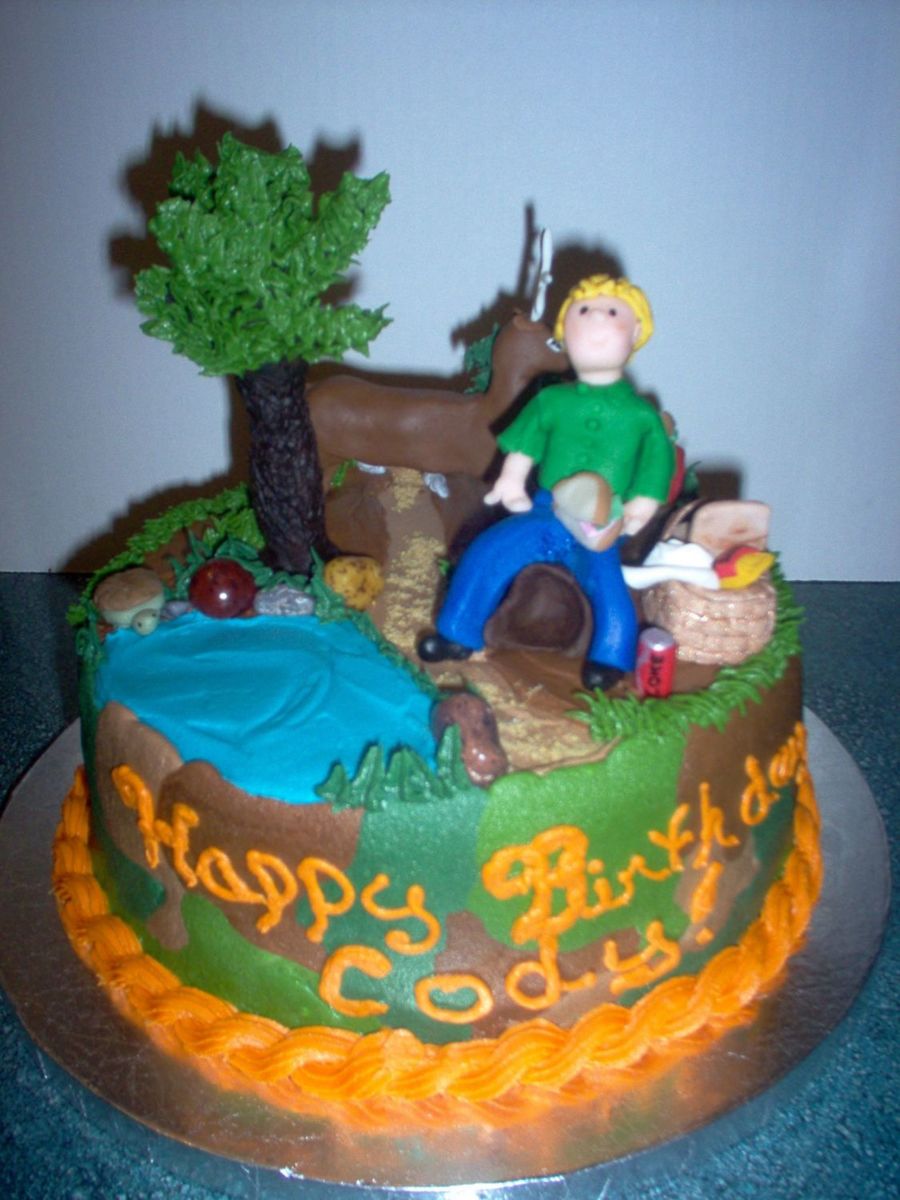 You can't see it from this side but the young boy has his gun propped behind him and the other half of his sandwich - the deer (which I had a really hard time with it kept looking like a dog LOL!) is eating the sandwich. Iced in butercream, candy rock, deer, figure and other decs are fondant. Thankrs for looking.