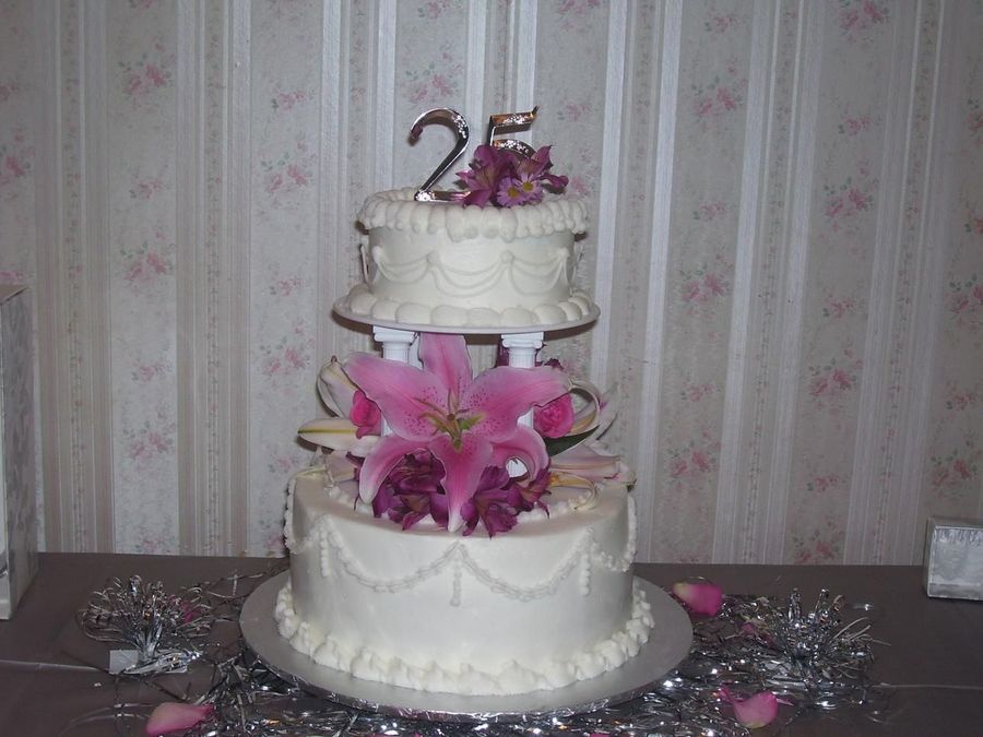 Fresh Flowers on 2 tier cake w/ pillars. Very simple design.