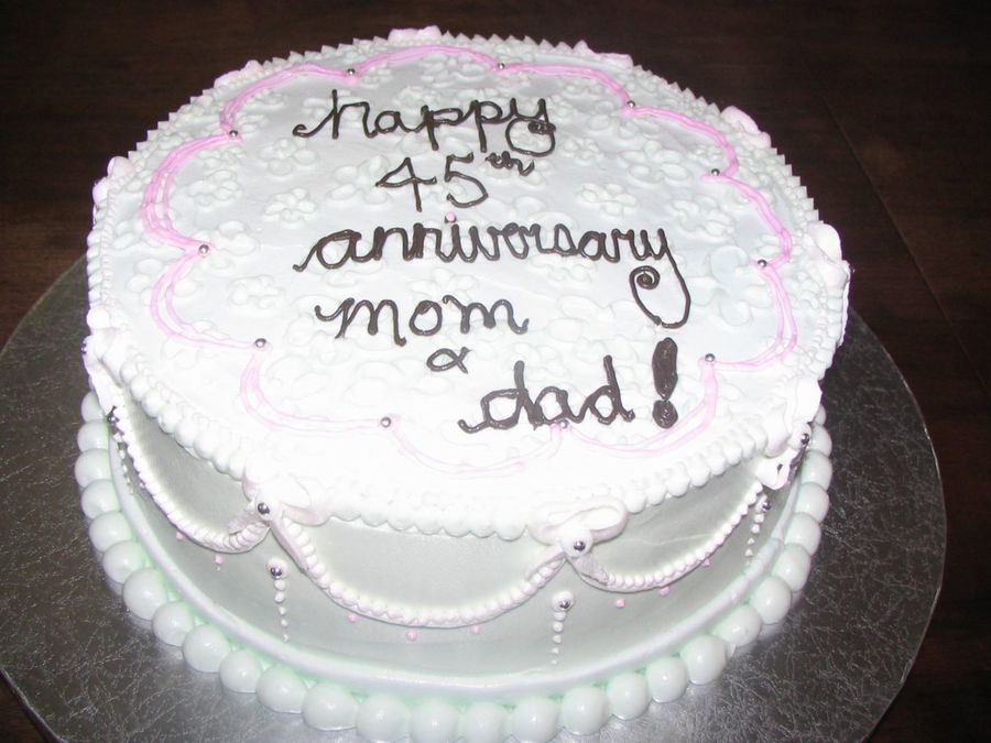 cakesbgood on 22 Jan 2007 , 4:15am It's a beautiful cake!! I bet they loved it! Wow, I thought I was doing good, just celebrated our 23rd, but 45 years!!! Congratulations to them ;-D