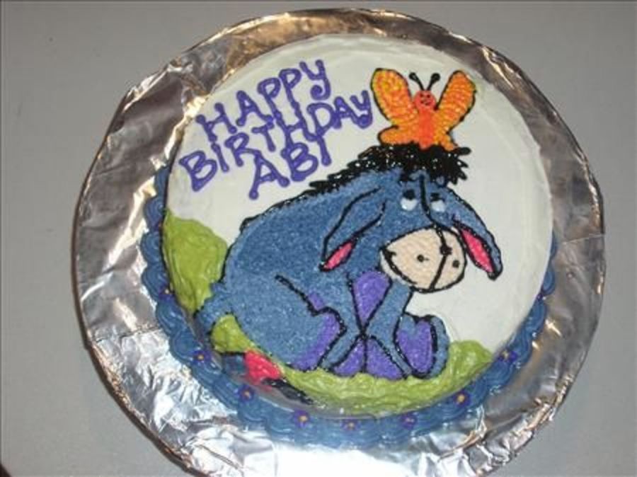 A birthday cake for my goddaughter's 3rd birthday. She is an Eeyore fanatic. I found the image online and used piping gel to transfer the image and piped the rest with buttercream.