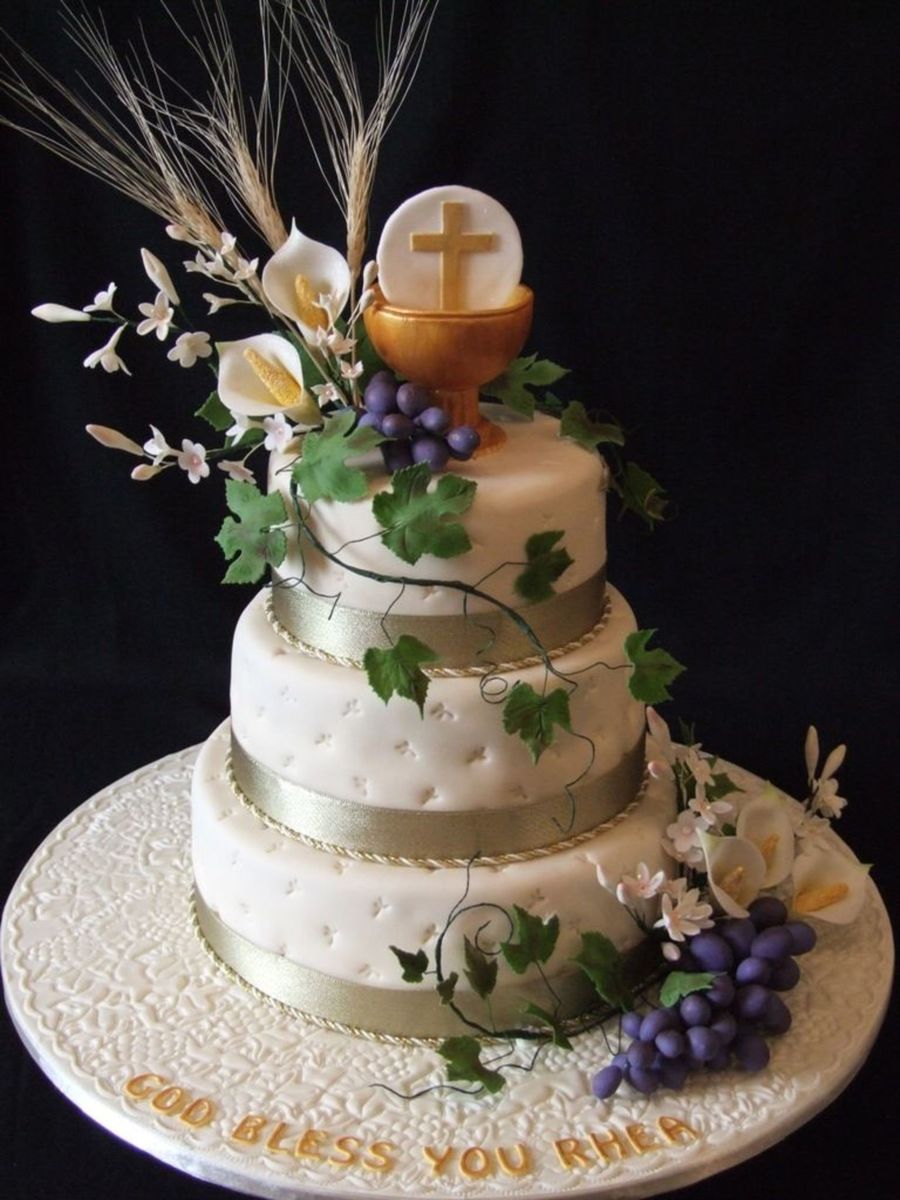 Chalice with host done out of fondant with cmc. Wired flowers out of flower paste. Cake covered with fondant and used a embossing stick to do little flowers.