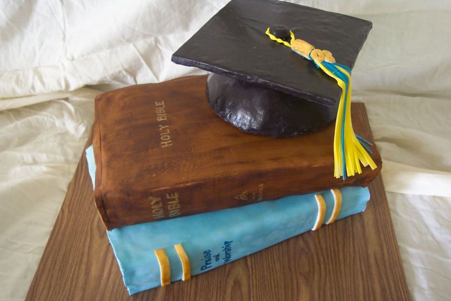 Made for a friend graduating from a Christian College, with a Worship Arts degree. Made a half sheet cake, half chocolate and half vanilla (used a parchment paper dam to separate while baking. Used each of those for one of the books. Made the cap with a doll pan, just used the top half, used cardboard covered in fondant for the top of the cap. Covered in MMF.