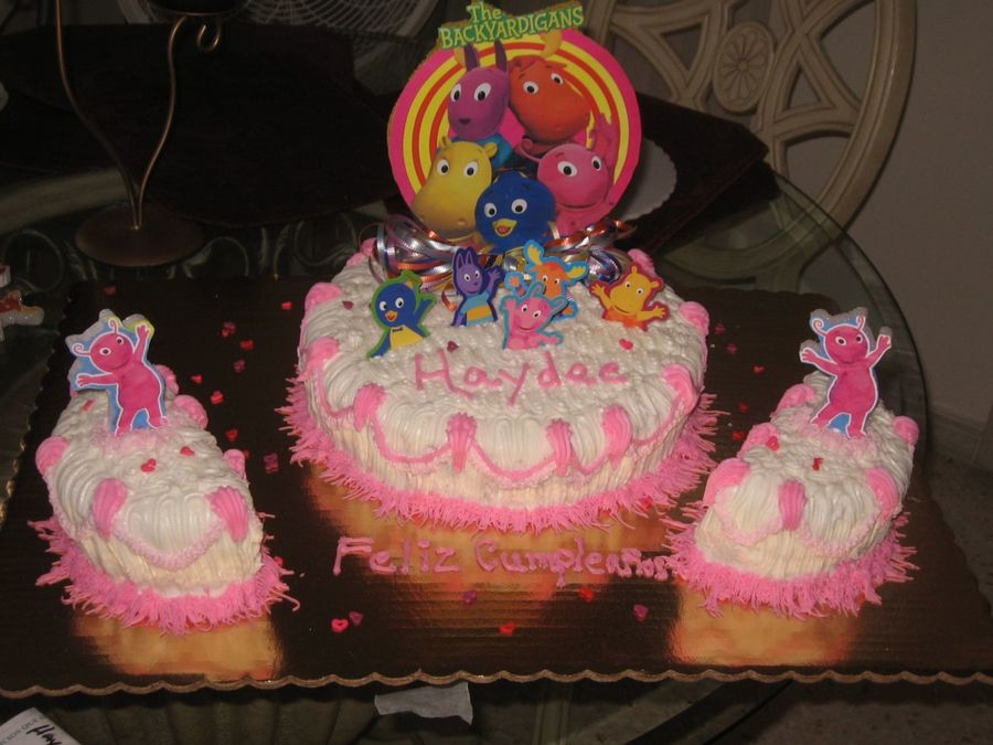 This cake was of our traditional Wet LICOUR vanilla/almond cake with icing and backyardigans is a printed image then placed in a foam.