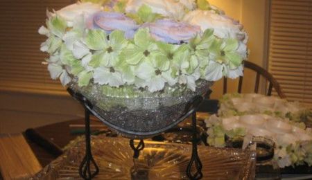 Huge thanks to kells_bells for the inspiration! I copied your cake almost exactly because I thought it was so beautiful!...although I think your cake is better! :) Gumpaste roses, fondant daisies. First time covering a cake in fondant. Used Michele Foster's Fondant....YUMMY!! TFL!