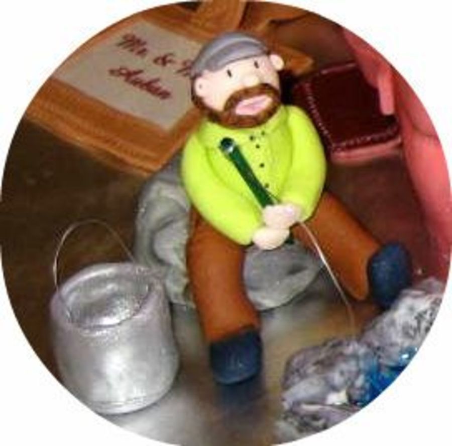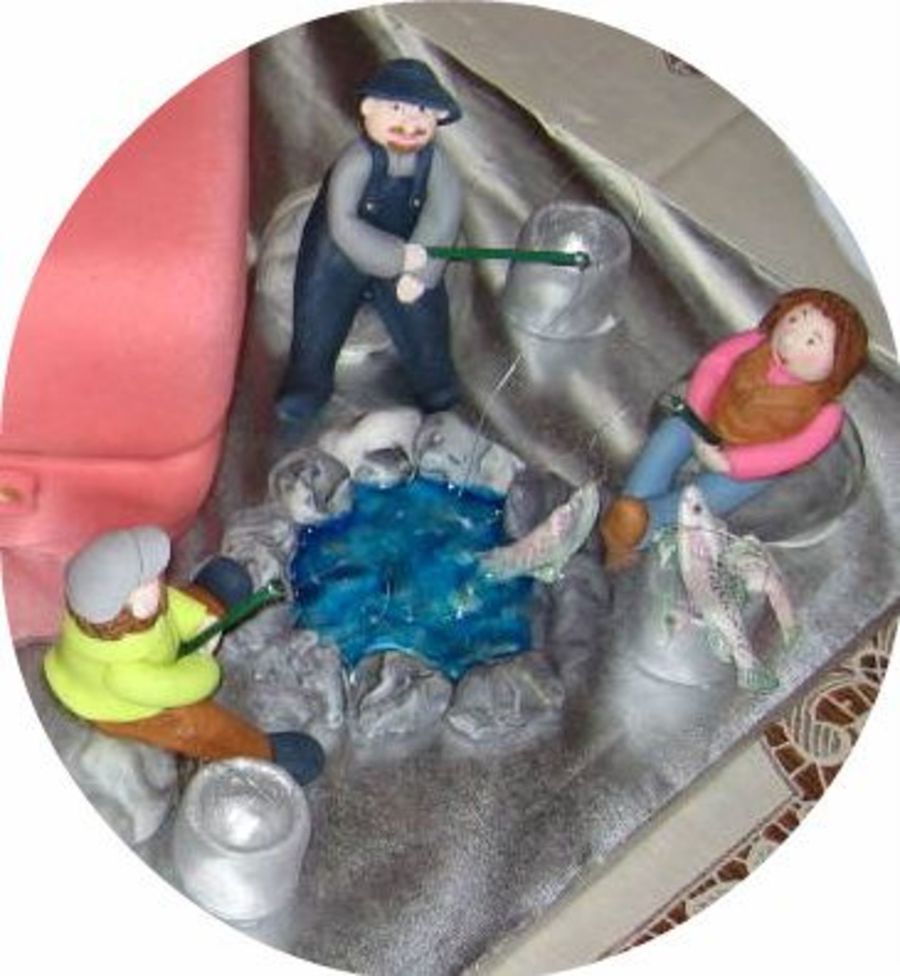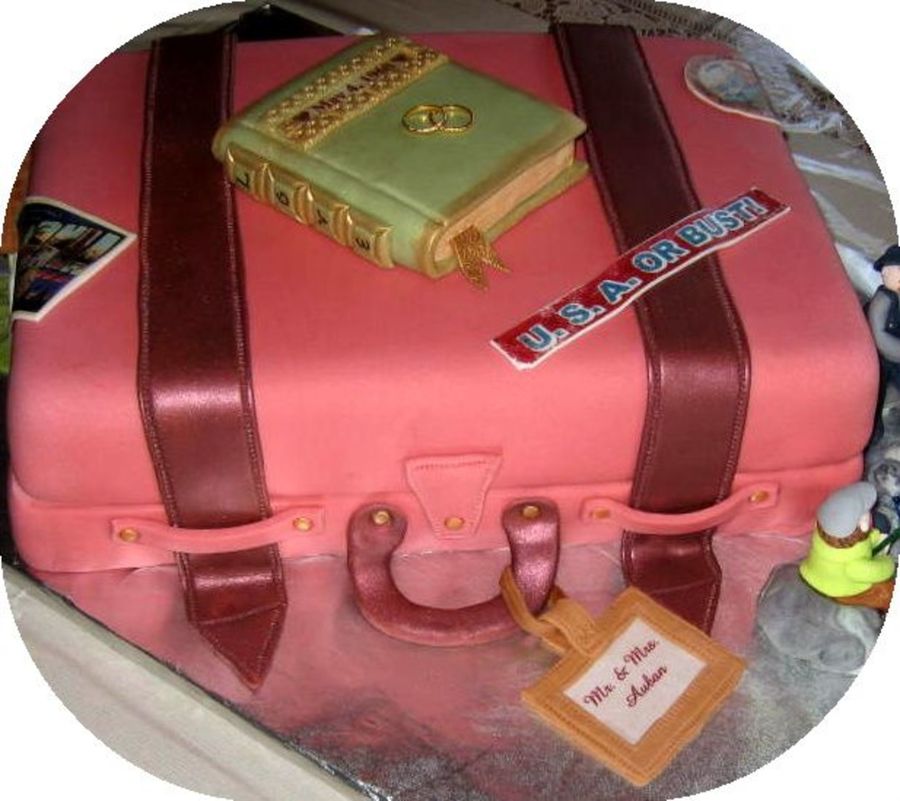 This cake is a 1/2 sheet cake x 3 buttermilk Devil's Food chocolate with cream cheese and whipped cream filling. All decorations are MMF. NO!! I didn't choose the color. It represents something special for the family of a couple celebrating 40 years of marriage. The couple arrived in the US from Spain with just one suitcase in 1968. All the decorations around the suitcase, including the rice krispie book, represents different milestones in their lives. I will post seperate pics of a few of the items.