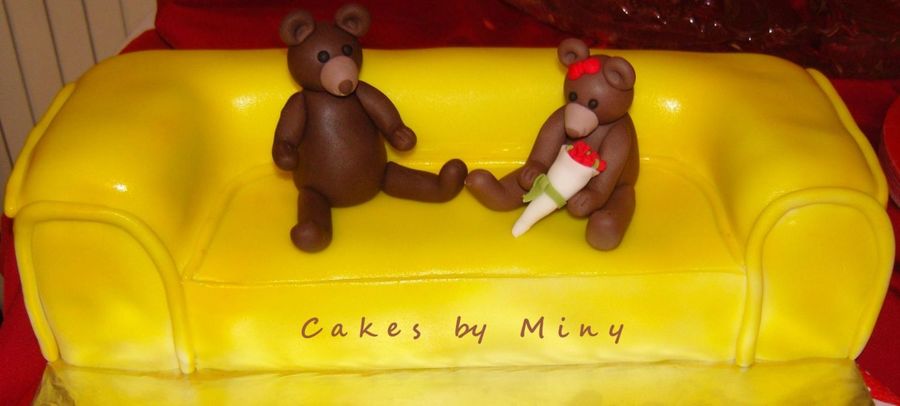 Sofa is carrot cake with cream cheese frosting covered in fondant, I made the bear couple including her rose bouquet out of fondant too. This cake was a hit at my church Valentine's banquet everyone wanted to take the bears home!