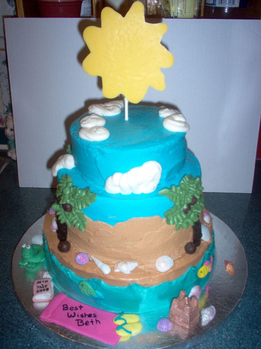 for a "tropical" themed bridal shower . strawberry cake with cream cheese frosting and fondant accents - castle, shells trunks of trees etc. Sun is candy melt. Thanks for all the great beach cakes on here that I took ideas from. Thanks for looking.