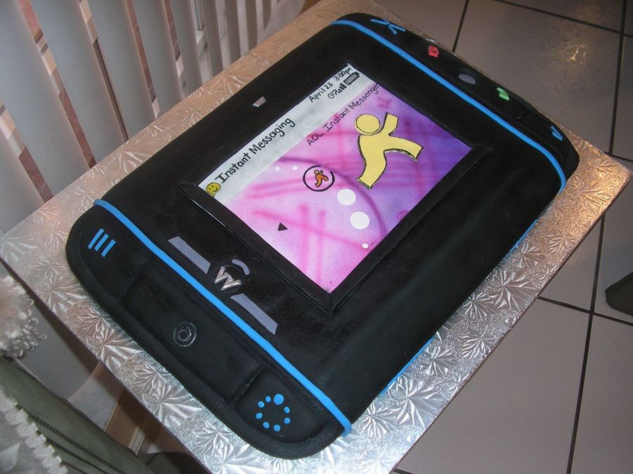 Motorola sidekick cellphone. 11x15 carved cake. Decorations are fondant, airbrush, and food coloring markers.