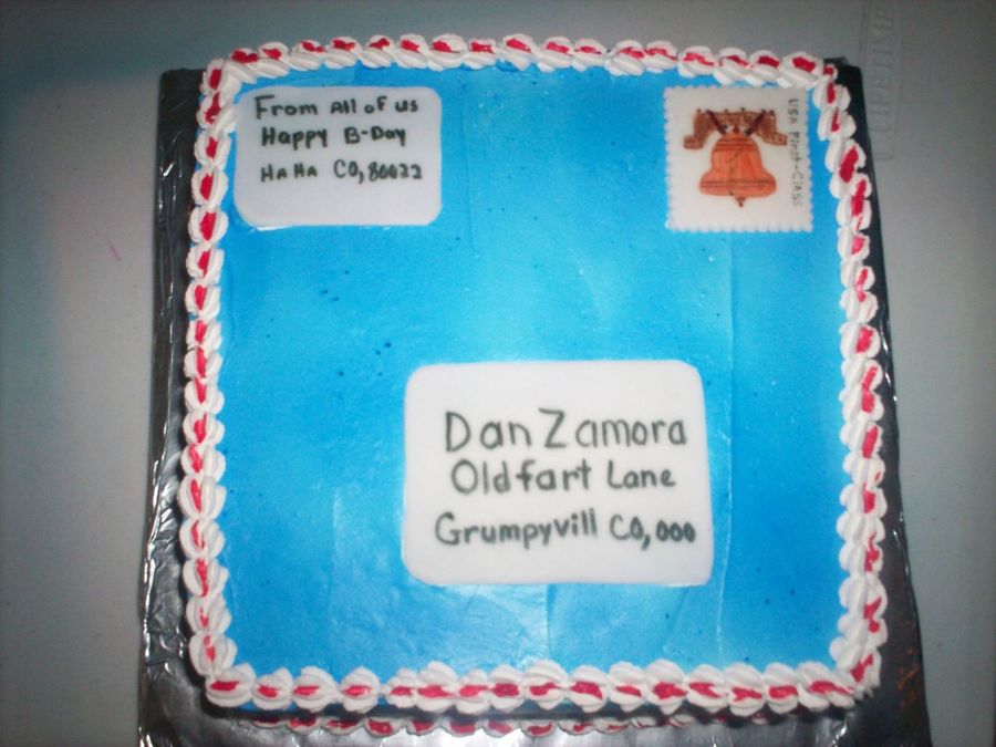 I made this for mybrother-in-law he works for the postal service i thought this would be funny, he is getting older now this is just a yellow cake with whippie icing and i used fondant to make the stamp and labels