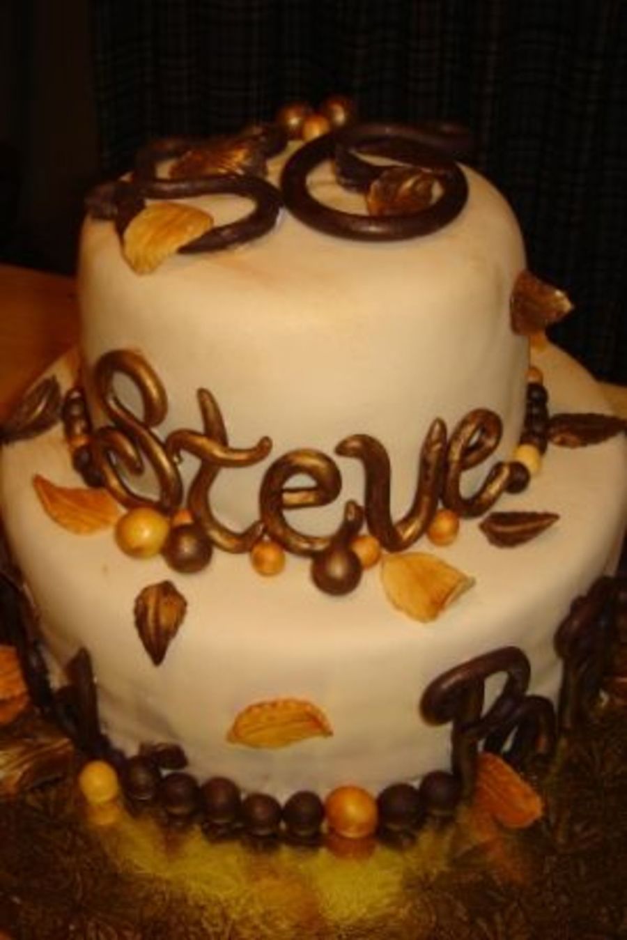 I made this cake for my wonderful father. The "50", leaves and words are all handmade from chocolate. The cake is covered in fondant.