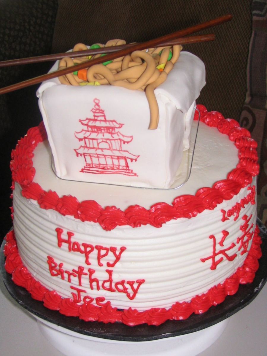 I made rhis for a friends husbands birthday who loves Chinese food. 10" marble cake covered in BC. Carton and food fondant. I had made fondant chop sticks but they broke in half so the chopsticks are real..