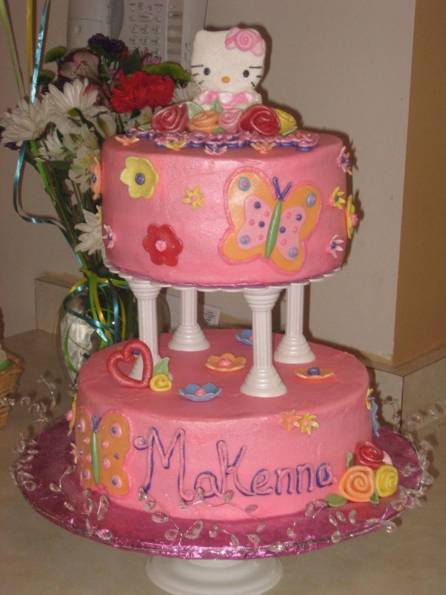 This was for my daughter this past weekend. She turned 6! Hello kitty cake was a "must have" for her. We were happy with how it came out. 10 in. bottom chocolate, and 8 in. top strawberry, with buttercream and fondant flowers. Store bought kitty. Thanks for looking!!!