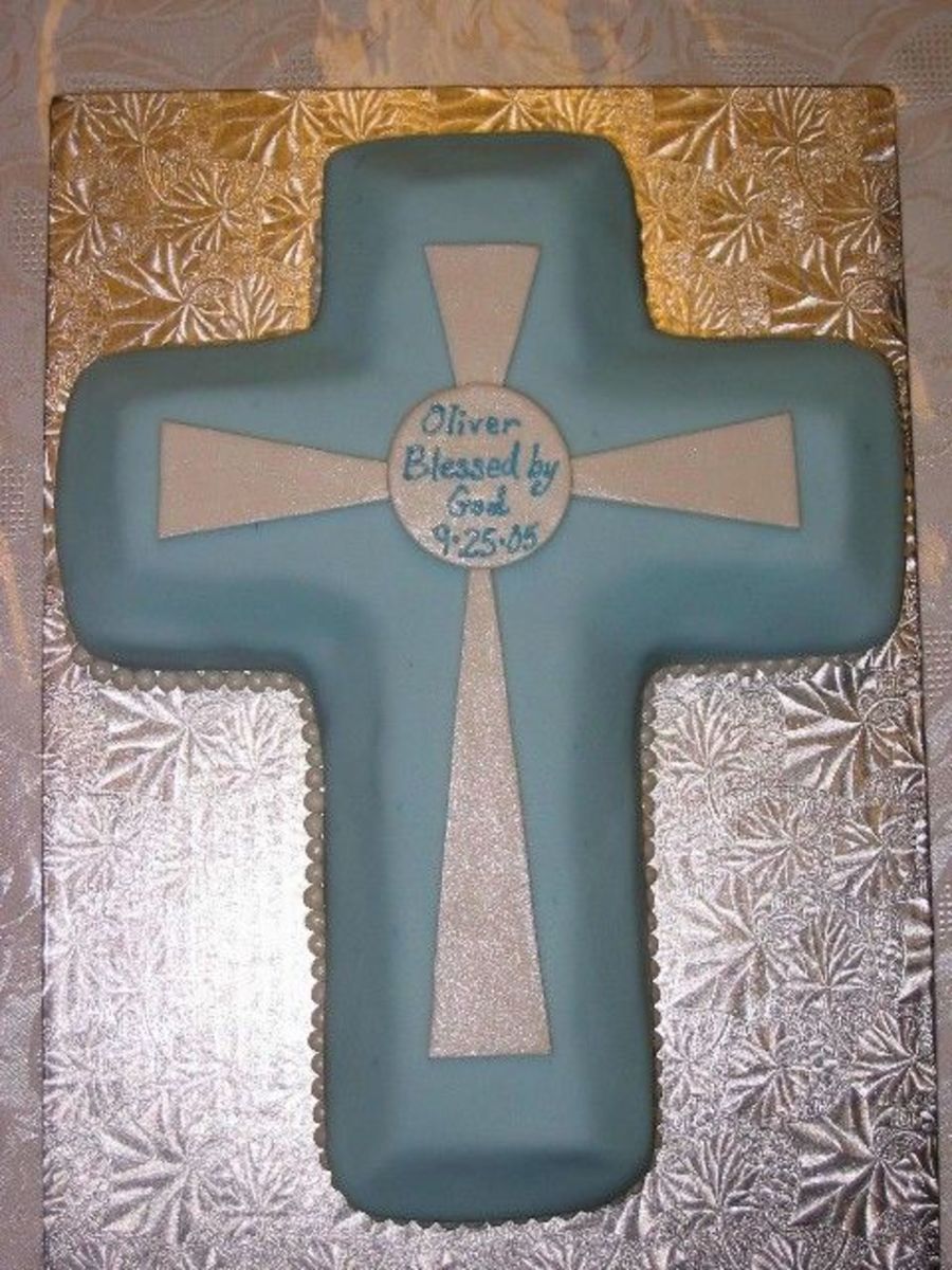 I made this for my nephew's baptism this past weekend. Cake is Chocolate with Oreo cookie filling (yummy!). Fondant covered with fondant decorations. Fondant pearls were handmade (took forever!) and rolled in pearl dust. Painted superpearl dust on cross sections and medallion for added interest. Plain and simple! Thanks for looking :)